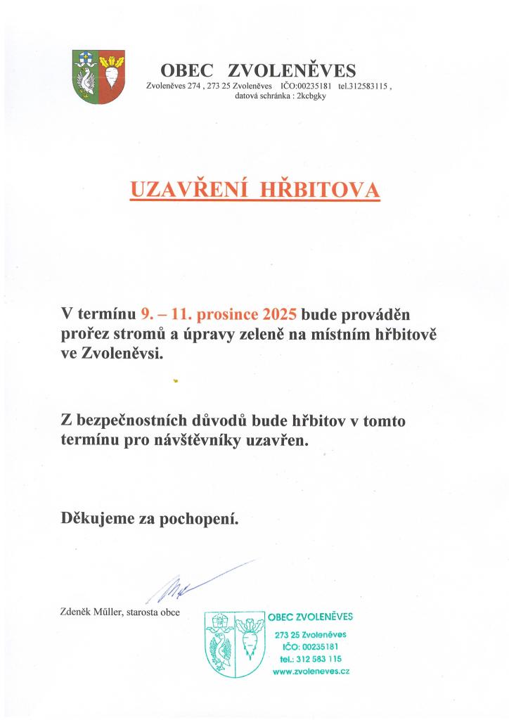 Z důvodu prořezu stromů bude 9-11.12. 2025 z bezpečnostních důvodů uzavřen vstup na hřbitov ve Zvoleněvsi.