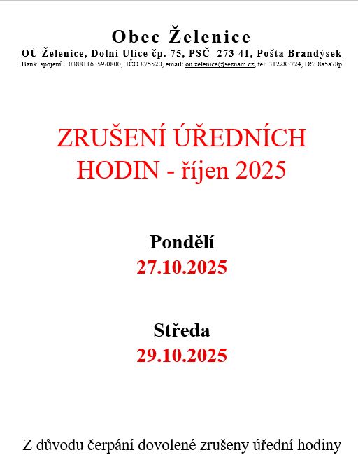 Z důvodu čerpání dovolené, zrušeny úřední hodiny 27.10 a 29.10.2025